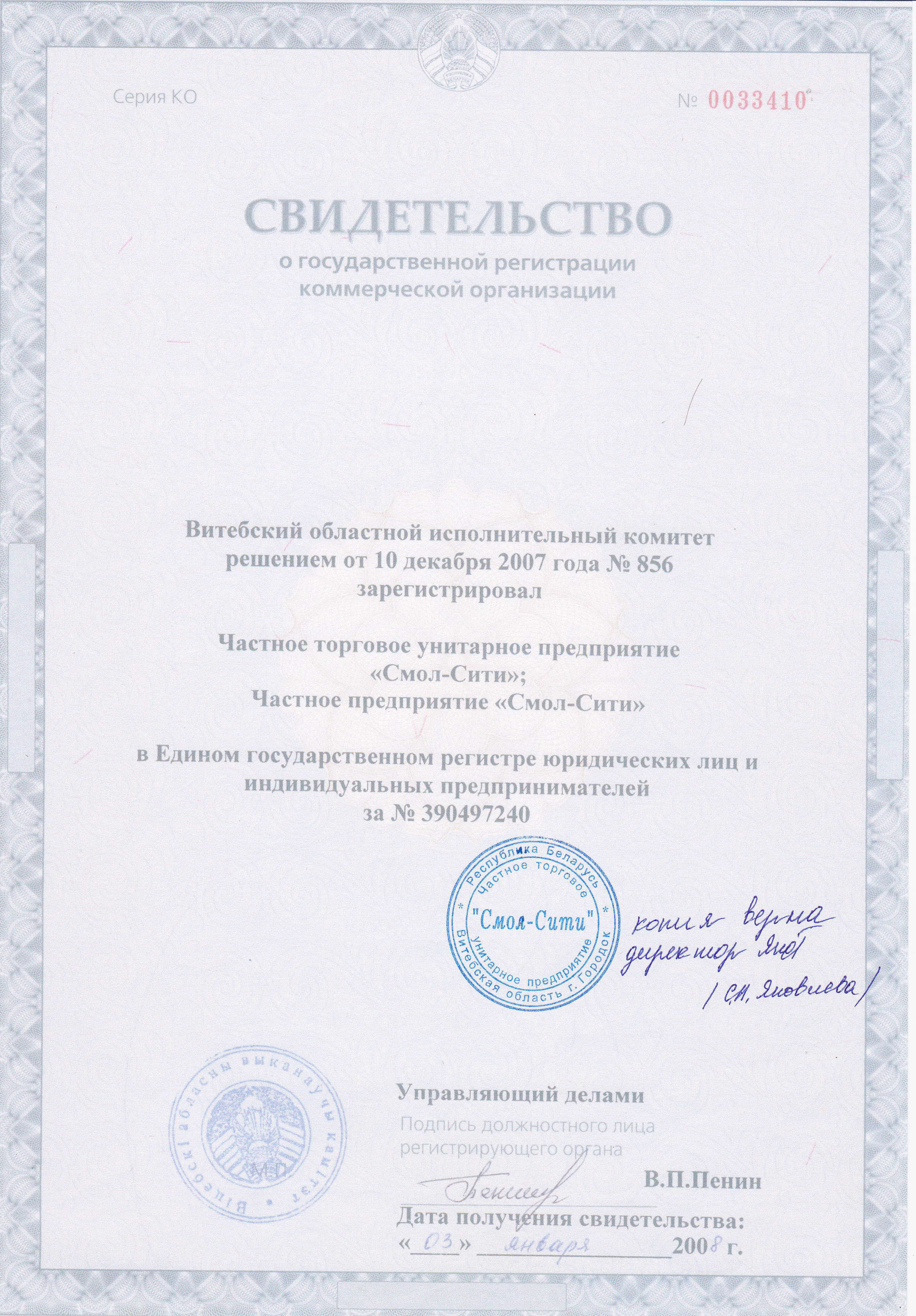 Свидетельство о регистрации Витебским областным исполнительным комитетом от 10 декабря 2007г. №856