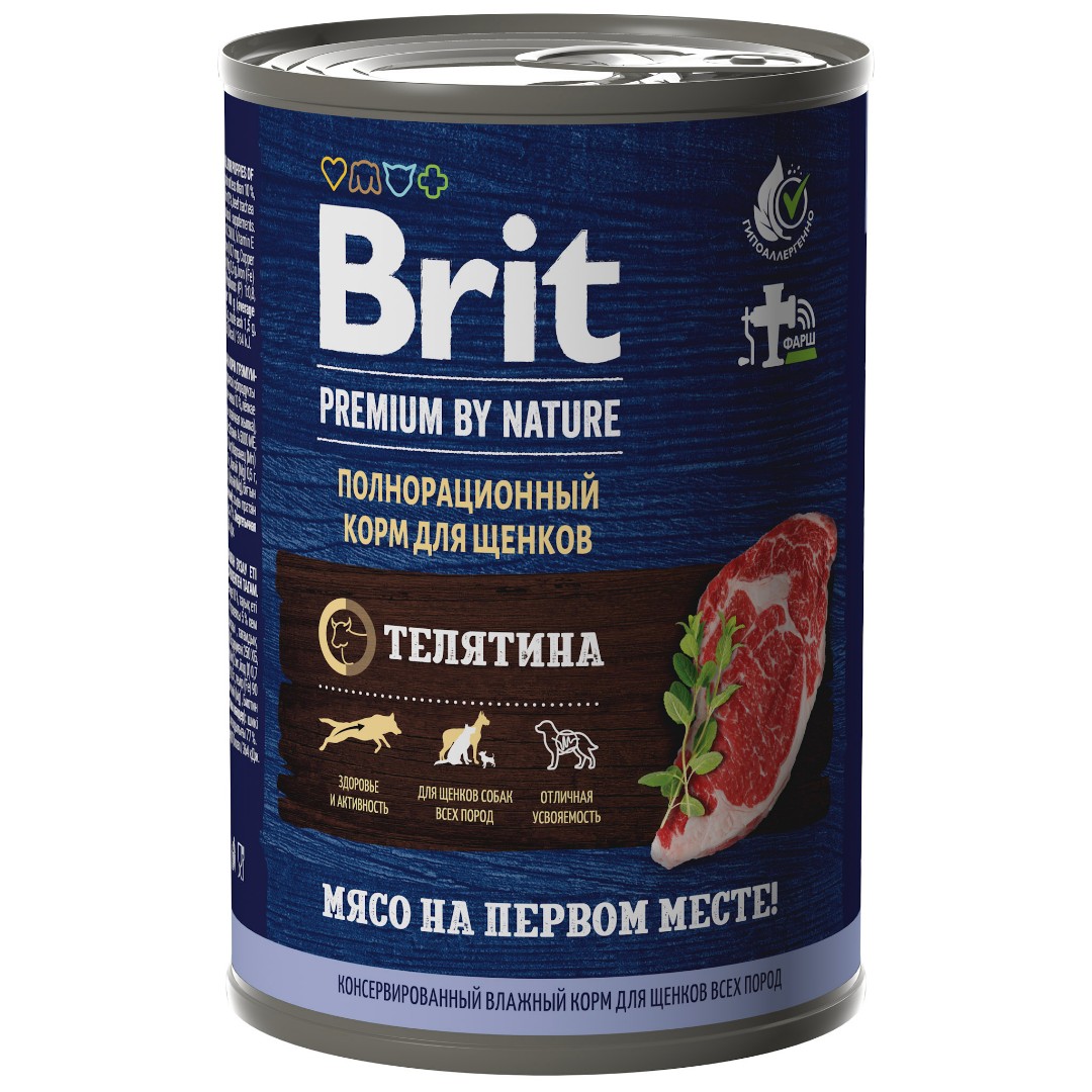 Полнорационный консервированный корм премиум класса телятина для щенков.