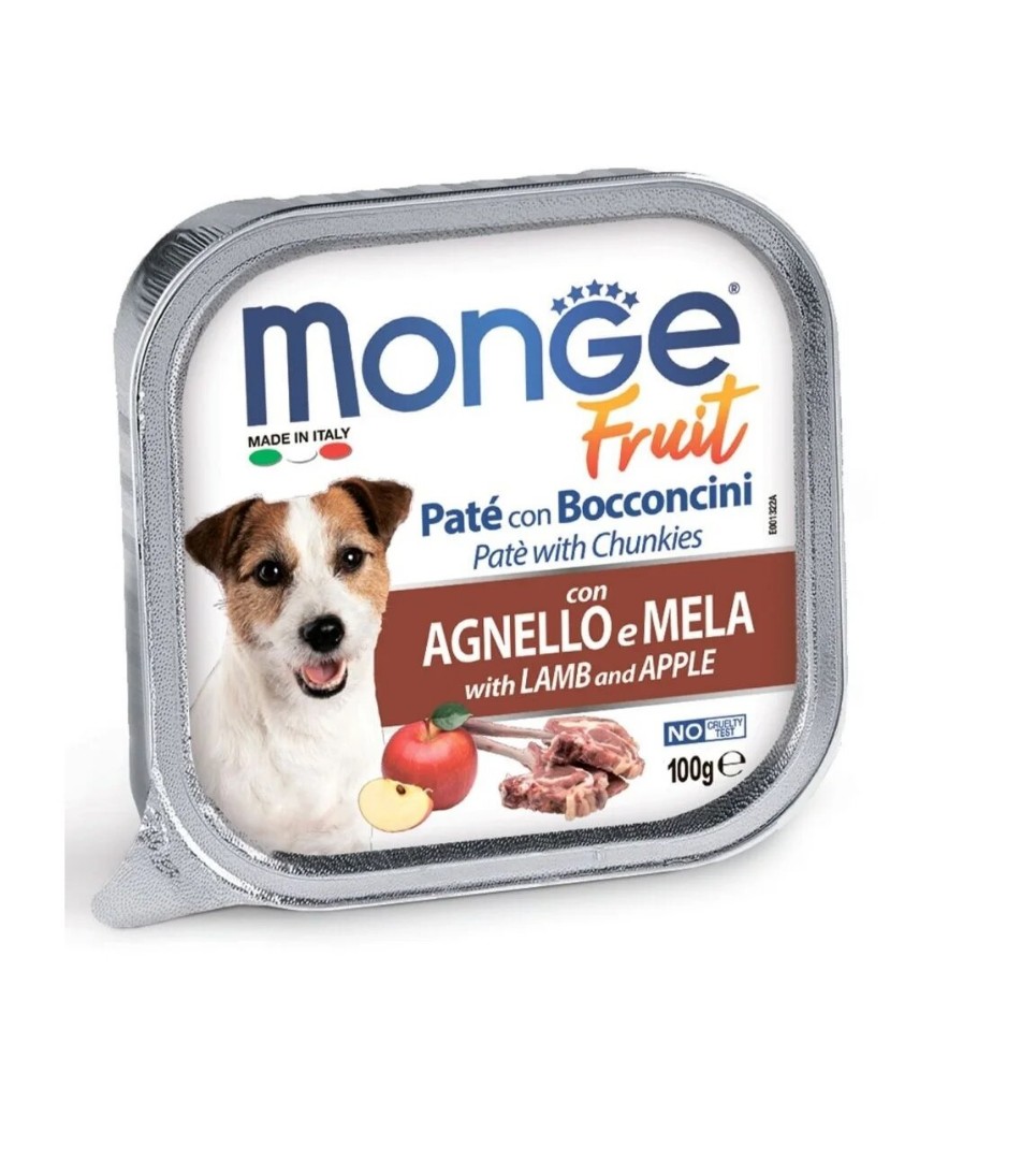 Monge (Монж) Dog Fruit полнорационный влажный корм с мясом ягнёнка и яблоком для взрослых собак всех пород 100 г. Аппетитные мясные кусочки ягнёнка в паштете со спелым яблоком из отборных ингредиентов высокого качества для взрослых собак. Особенная технология приготовления, путем смешивания мясных кусочков и паштета, придаёт корму необычную текстуру, что сможет удивить и заинтересовать вашего питомца. Без ГМО, искусственных красителей и ароматизаторов. Сделано в Италии.