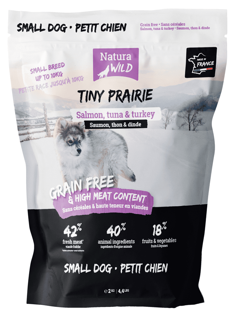 Natura Wild Tiny Prairie — Беззерновой корм для взрослых собак миниатюрных пород. 42% свежего и 11% дегидрированного лосося, а так же 19% дегидрированного мяса индейки – полностью перекрывают пищевые потребности собак весом до 10 кг. Адаптированная под размеры челюсти гранула, не доставит дискомфорта вашей собаке. Не содержит зерновых, для максимального снижения риска развития аллергии и ожирения у питомца.